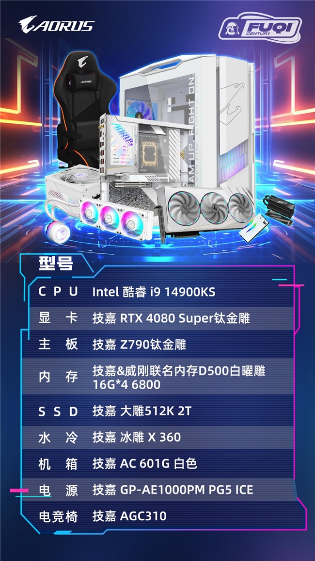 这次AORUS为艾福杰尼准备的主机是根据其个人风格定制的AORUS全家桶,板卡为限量300套的钛金雕Z790主板+RTX 4080 SUPER显卡套装。