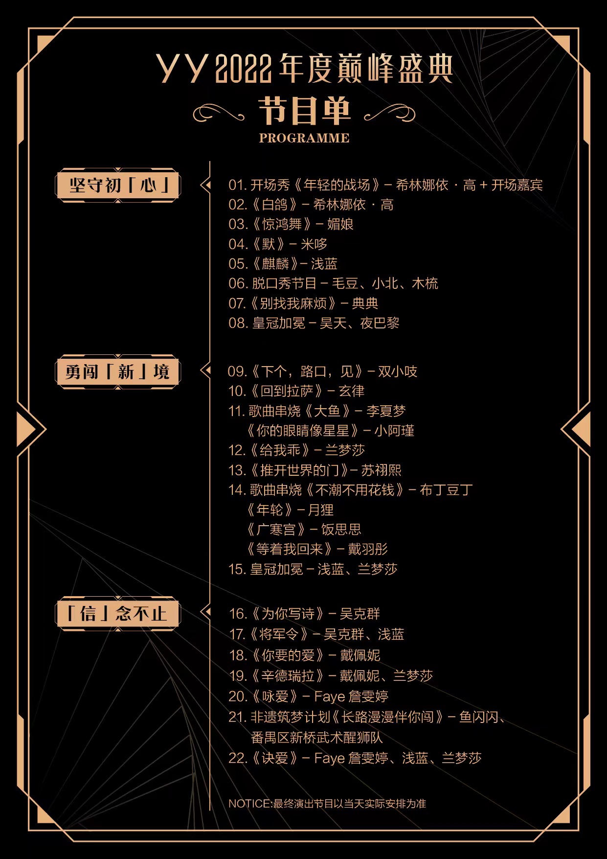 除了明星主播合作秀之外,今年盛典值得大家期待的节目还有很多。希林娜依·高将与嘉宾们共同献上开场秀《年轻的战场》,为正在拼搏的年轻人们加油打气;詹雯婷也将带来一首《咏爱》,她极具穿透力的嗓音将唤醒许多观众的青春回忆;毛豆、小北的脱口秀表演也将让盛典现场爆笑不断。同时,YY年度最佳男音乐人玄律、年度最佳女音乐人米哆、年度最佳魅力舞者媚娘、年度最佳组合双小吱以及最佳颜艺星秀小阿瑾、年度最佳女脱口秀艺人典典、年度最佳新人苏祤熙等盛典线上赛各赛道的冠军主播们也将轮番上阵,带来丰富多样的精彩表演,让现场与直播间的观众们共同见证他们的高光时刻。