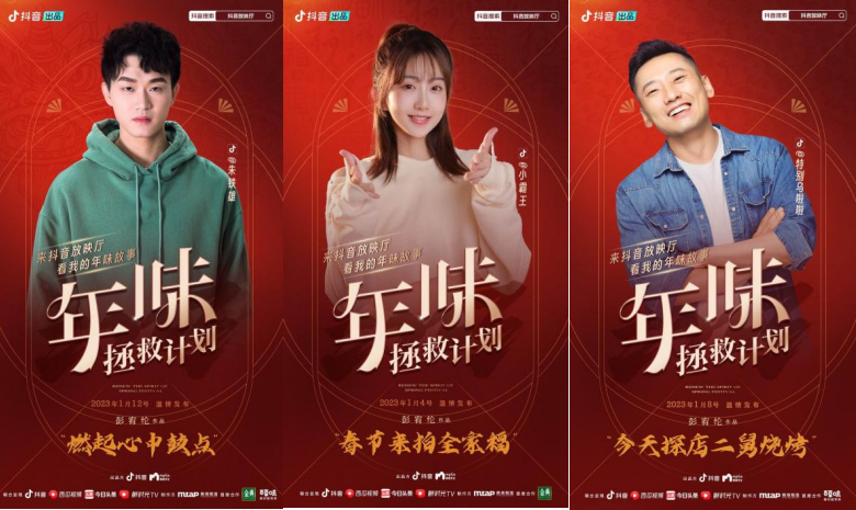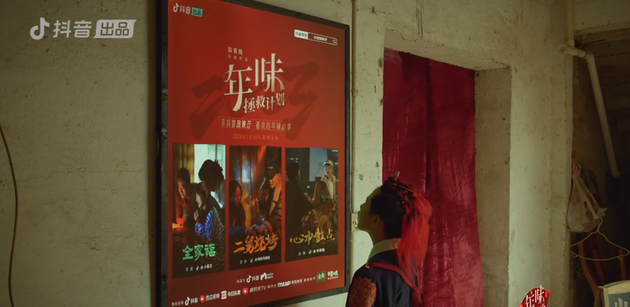 洞察这一机遇,2023年春节之际,抖音发布微电影《年味拯救计划》,3支创意短片,组成了一个传承年味的特别“贺岁片”,在各平台获得广泛传播,抖音官方话题#年味拯救计划 斩获2.4亿播放量,打出“迎合大众情绪+传承中国传统文化”响亮一枪的同时,“抖音放映厅”也顺利扩传。