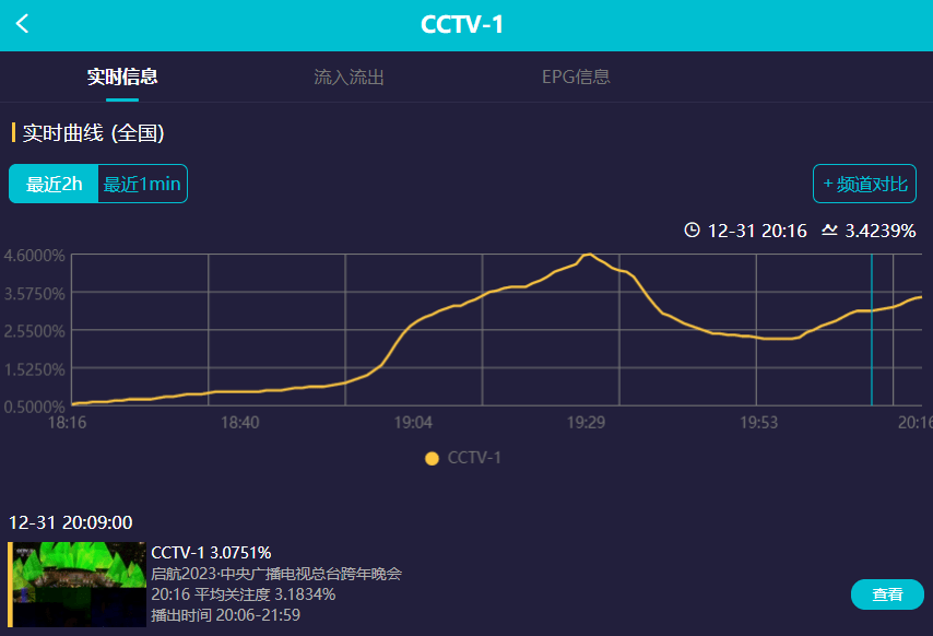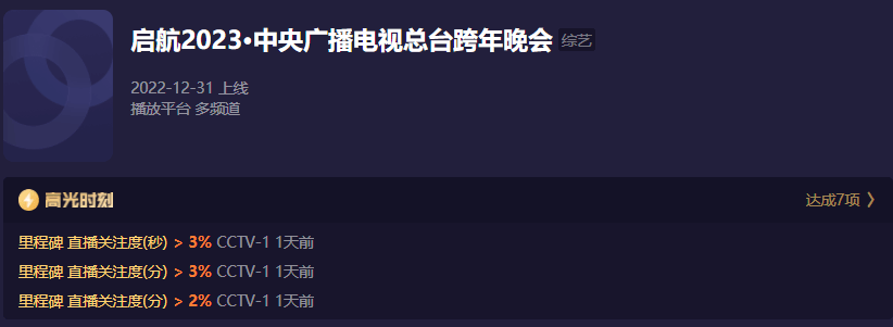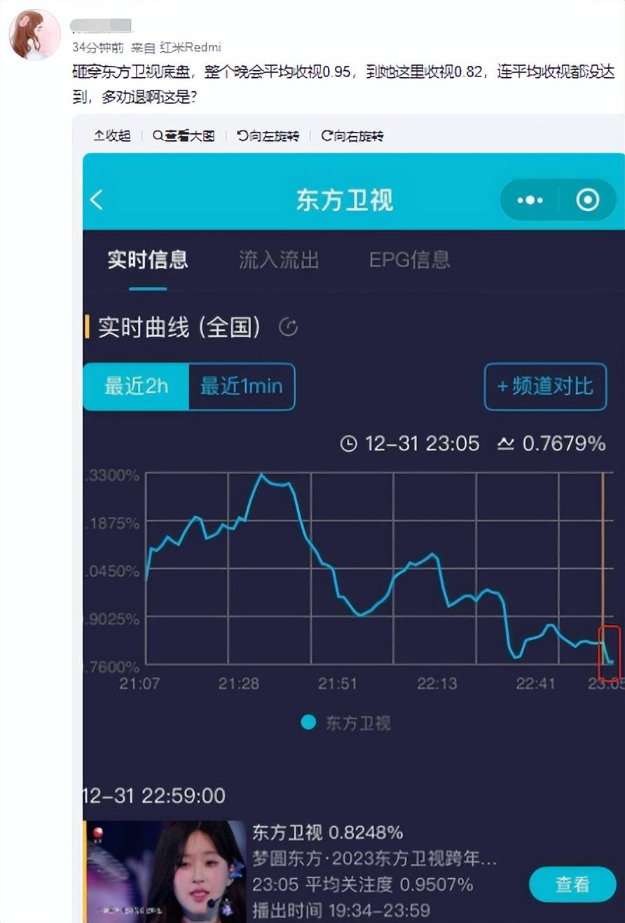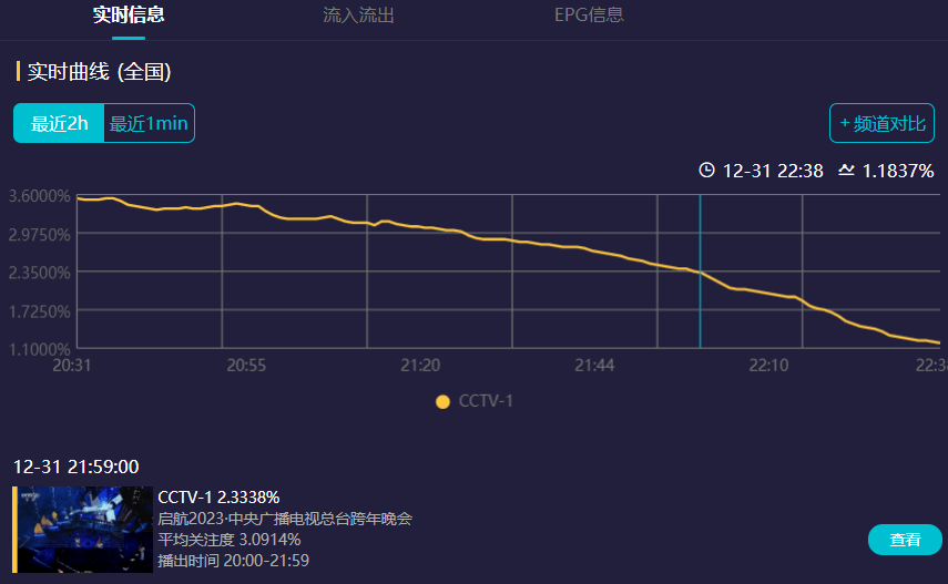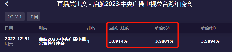 央视跨年晚会的导演组应该也都心中有数,没等到零点就结束了晚会,最终收视落点停留在了2.3,把平均收视维持在了3以上。