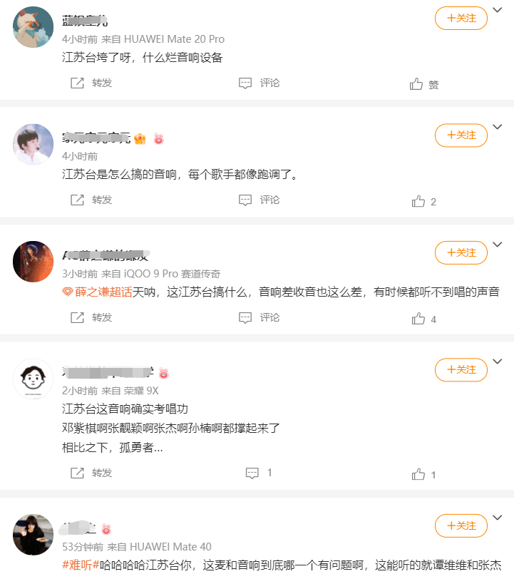 薛之谦、王俊凯、王源等人纷纷败给音响,谭维维、张杰、张靓颖难得撑住,于是江苏台收视就出现了一个神奇的现象——观众全程进来又出去,最低跌破1最高能破2,起起伏伏仿佛心电图。
