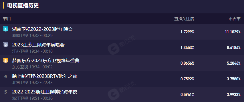 实际上,每一年跨年晚会收视最大悬念主要在第二名,或者说要看谁是卫视第一,这里就不急着揭晓答案啦,先来了解各台具体收视表现吧!