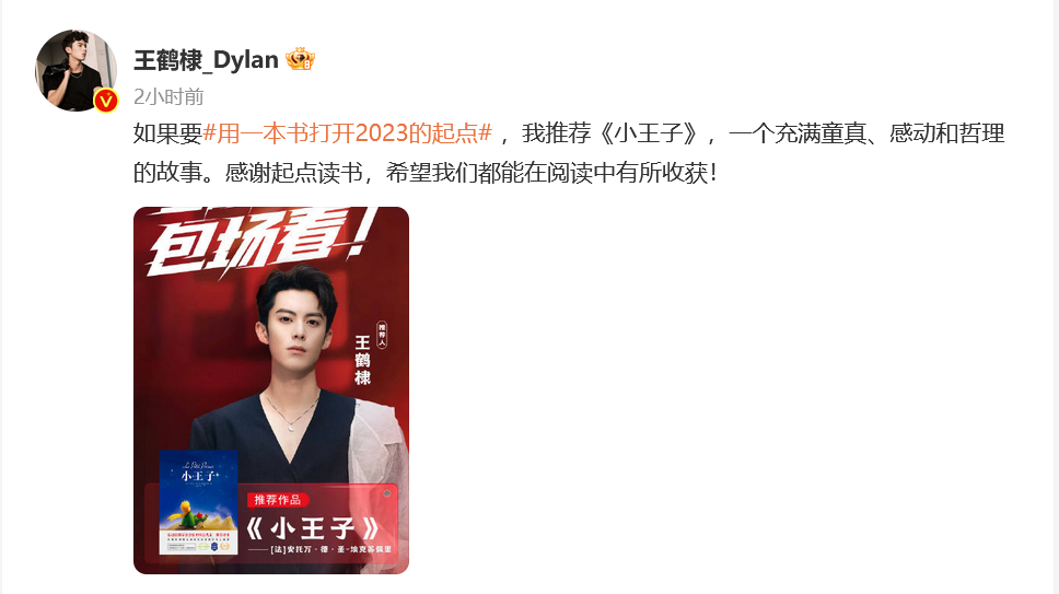 《小王子》是法国作家安托万·德·圣-埃克苏佩里于1942年写成的著名短篇小说,以主人公小王子童真的视角,发掘世间的真情和温馨。王鹤棣表示:“如果要用一本书打开2023的起点,我推荐《小王子》,一个充满童真、感动和哲理的故事。感谢起点读书,希望我们都能在阅读中有所收获。”