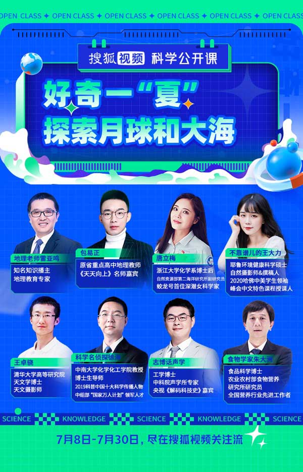 7月11日与7月20日正值中国航海日与人类月球日,两个专场关联度高,系统性的专题直播公开课更能引导新时代青少年对科学奥秘的探索,激发他们对科技的好奇心,培养他们崇尚科学的精神。搜狐视频将在本月邀请地理、天文、声学、食物学、化学、海洋生态与环境健康等专业领域的8位重量嘉宾,进行8场系列直播,每周2场,在观众心中播撒科学种子,特别是让更多的青少年心怀科学梦想、树立创新志向。