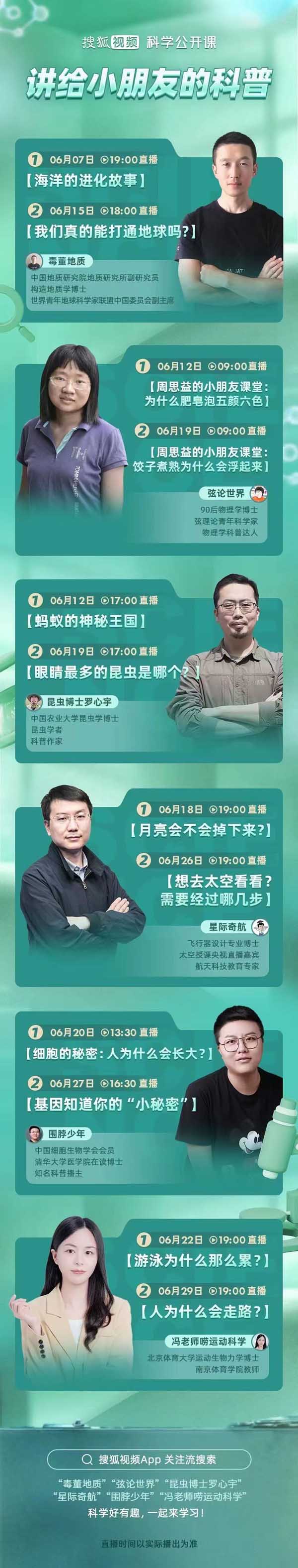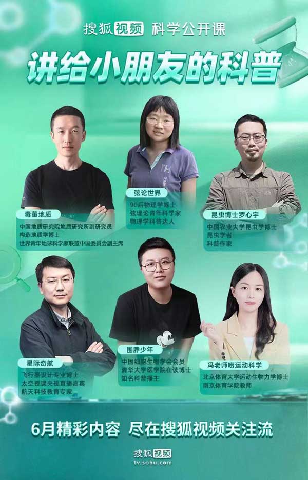 本周还将有四场同样“含金量”满满的直播来袭,内容分别为6月15日18:00地质学博士毒董地质直播的《我们真的能打通地球吗?》;6月18日19:00飞行器设计专业博士、航天科技教育专家星际奇航直播的《月亮会不会掉下来?》;6月19日9:00物理学博士弦论世界直播的《周思益的小朋友课堂:饺子煮熟为什么会浮起来》;6月19日17:00昆虫学博士罗心宇直播的《眼睛最多的昆虫是哪个?》。四位重量级达人大V将在线上进行科学直播,带领大家一起探索科学、科技的奥秘。用户只需打开搜狐视频,进入“关注流”,便可观看精彩直播内容。