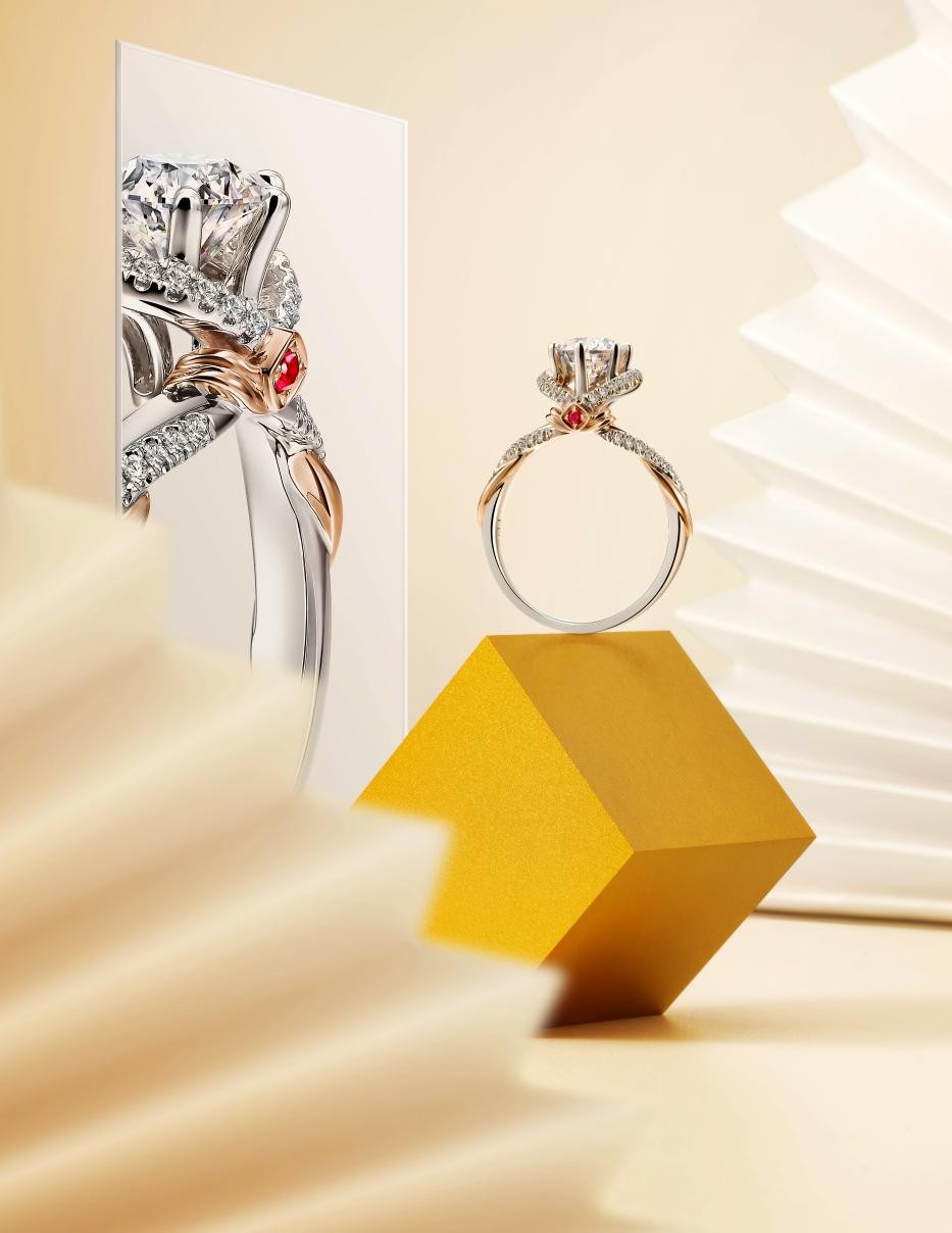 I Do真爱加冕系列全新公主款以独特的设计致敬当代女性,映照她们每一面的自我。作品灵感源自伊丽莎白一世,作为文艺复兴时期的杰出君主,伊丽莎白代表着优雅与尊贵,其标志型的拉夫领更是成为贵族阶层的时尚标杆,传承至今。汲取女性君主庄重典雅的风格,融合I Do经典美学,本作品将拉夫领的倾斜弧度,化作戒指花头灵动的倾斜角度。平视角度下更加拉长手部的线条,立视角度下则凸显出钻石的璀璨。多角度都有不同形态与光泽的精彩映照,生动诠释女性的多面魅力,恰如生活中不断变换角色的“她”,从少女的懵懂、热恋的投入再到婚姻的真挚,即便迎来人生的全新阶段,内心始终抱有坚定的力量与永葆的信念。全新公主款用不竭的智慧、端庄的设计,犒赏女性内心永恒的坚持与热爱,彰显当代女性公主般的胆识与勇气,在人生的每一刻都能自信闪耀。
